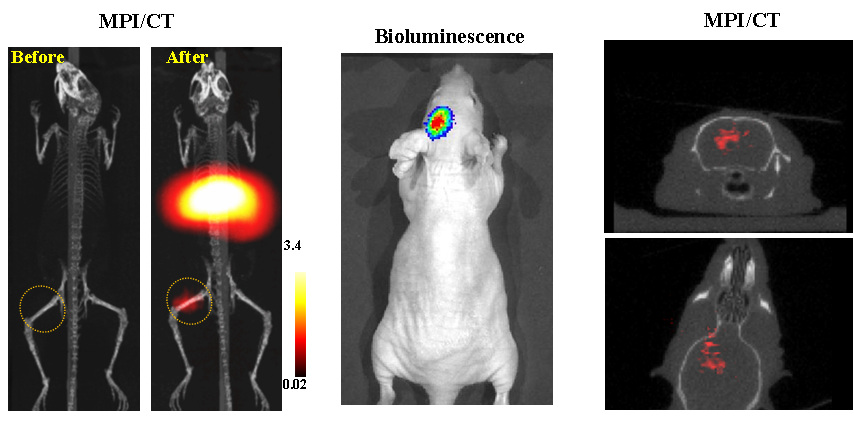 今年二月份,宋國(guó)勝教授與斯坦福大學(xué)饒江宏教授合作,通過(guò)系統(tǒng)的研究獲得了影響磁性粒子成像信號(hào)的作用規(guī)律和關(guān)鍵原理,開(kāi)發(fā)了新型磁性粒子探針---FeCo合金粒子,并首次應(yīng)用于磁性粒子成像(MPI)。該造影劑在極低含量時(shí)(5 ng)仍具有很強(qiáng)的造影效果。這意味著,未來(lái)在進(jìn)行人體成像時(shí),可以使用更小劑量的造影劑,從而避免高劑量造影劑引起的腎肝損傷。基于MPI的直接成像原理,我們可以對(duì)造影劑進(jìn)行正相和無(wú)背景干擾的活體成像,極大地提高信噪比。這項(xiàng)技術(shù)為腫瘤早期診斷、癌細(xì)胞示蹤、腦中風(fēng)、藥物輸送治療、肺部灌注成像、胃腸出血、神經(jīng)退行性疾病、磁熱治療等在活體中的可視化研究,提供了強(qiáng)有力的手段。相關(guān)研究成果以湖南大學(xué)為第一單位發(fā)表在Nature 子刊《Nature Biomedical Engineering》(IF = 18.952)。該期刊是“生物醫(yī)學(xué)工程”的頂級(jí)期刊。宋國(guó)勝教授為該論文的共同通訊作者。