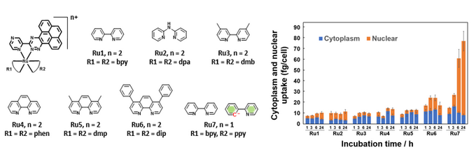 圖2. 釕(II)配合物細(xì)胞攝取及細(xì)胞核靶向性