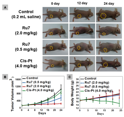 抗腫瘤實(shí)驗(yàn)表明Ru7能誘導(dǎo)腫瘤細(xì)胞發(fā)生壞死性凋亡。細(xì)胞信號(hào)通路研究證實(shí)Ru7通過(guò)抑制Topo I/II活性、誘導(dǎo)DNA損傷、激活DNA修復(fù)酶PARP-1及下游RIPK1-RIPK3-MLKL壞死性凋亡核心通路,從而有效地克服腫瘤耐藥(圖3)。該研究首次揭示了釕(II)配合物通過(guò)抑制拓?fù)洚悩?gòu)酶,誘導(dǎo)腫瘤細(xì)胞壞死性凋亡之間的內(nèi)在聯(lián)系。作者進(jìn)一步開展了小鼠耐藥腫瘤模型測(cè)試,評(píng)估誘導(dǎo)腫瘤細(xì)胞壞死性凋亡的金屬配合物活體抗腫瘤效果。實(shí)驗(yàn)結(jié)果表明,經(jīng)過(guò)4天1次腹腔注射給藥,連續(xù)24天治療后,Ru7在裸鼠耐藥腫瘤模型中表現(xiàn)出非常優(yōu)異的抗腫瘤活性;荷瘤鼠主要組織器官的切片染色觀察表明Ru7并沒(méi)有造成明顯的組織損傷或病變,同時(shí)給藥組的裸鼠也沒(méi)有出現(xiàn)體重下降或行為異常的情況(圖3)。
