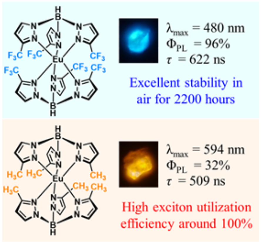 北京大學(xué)化學(xué)與分子工程學(xué)院黃春輝課題組劉志偉副教授等另辟蹊徑,提出并證明了具有d-f允許躍遷特性的稀土Eu(II)配合物可以通過合理的分子結(jié)構(gòu)設(shè)計(jì)實(shí)現(xiàn)高空氣/熱穩(wěn)定性和高發(fā)光效率,以及這類材料應(yīng)用于OLEDs時(shí)具有接近100%的激子利用率和高亮度下較低的效率衰減。