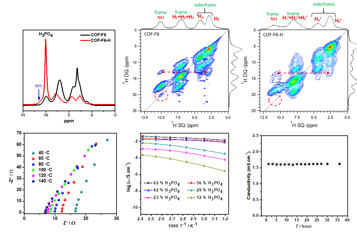 鑒于此,張根教授團(tuán)隊(duì)開(kāi)發(fā)了一種自下而上的自組裝策略,構(gòu)建了全氟烷基官能化的二維COF,并系統(tǒng)地研究了不同長(zhǎng)度的氟鏈對(duì)COF晶態(tài)和質(zhì)子傳導(dǎo)性能的影響。與無(wú)氟的COF相比,由于增強(qiáng)的疏水性,氟化COF對(duì)強(qiáng)酸具有超強(qiáng)結(jié)構(gòu)穩(wěn)定性,在濃磷酸(85%),濃硝酸(65%)和濃鹽酸(38%)中均可穩(wěn)定存在。表征結(jié)果發(fā)現(xiàn),在磷酸摻雜修飾后,氟化的COF材料在無(wú)水條件下的質(zhì)子傳輸導(dǎo)電性達(dá)到目前有機(jī)多孔材料無(wú)水質(zhì)子傳輸性能最高的例子之一,同時(shí)這一離子傳輸性能是無(wú)氟COF的一萬(wàn)倍。通過(guò)固體NMR表征結(jié)果顯示,磷酸在COF通道中通過(guò)氫鍵相互連接,大多數(shù)的磷酸具有較強(qiáng)的可移動(dòng)性,同時(shí)COF框架結(jié)構(gòu)呈剛性,從而具有快速傳導(dǎo)質(zhì)子的性能。本文為通過(guò)COF孔結(jié)構(gòu)設(shè)計(jì),實(shí)現(xiàn)其導(dǎo)向性功能化,提供了COF功能化修飾的成功范例。這一研究為孔表面的預(yù)先設(shè)計(jì)和功能化,實(shí)現(xiàn)COF的目標(biāo)性能鋪平了道路,并凸顯了COF納米通道作為快速離子傳輸平臺(tái)的巨大潛力。