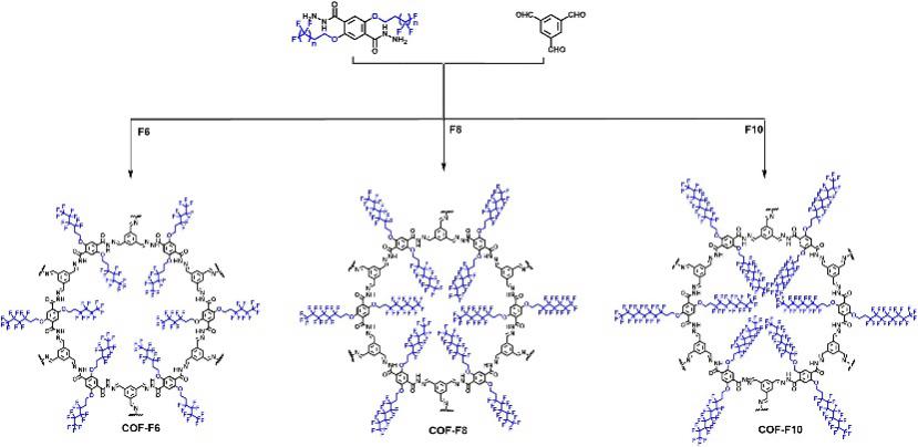 共價(jià)有機(jī)骨架(COF)是一類新型的晶態(tài)有機(jī)多孔聚合物,是有機(jī)結(jié)構(gòu)單元通過(guò)共價(jià)鍵連接而成的有序的框架結(jié)構(gòu)。它們的顯著特征之一是結(jié)構(gòu)與性能的可調(diào)控性。二維COF形成的均勻1D通道與Nafion結(jié)構(gòu)中通道相似,這使它們成為質(zhì)子傳輸?shù)臐撛诓牧稀5?,傳統(tǒng)COF材料的化學(xué)穩(wěn)定性較差,限制了其在酸性質(zhì)子交換隔膜中的應(yīng)用。