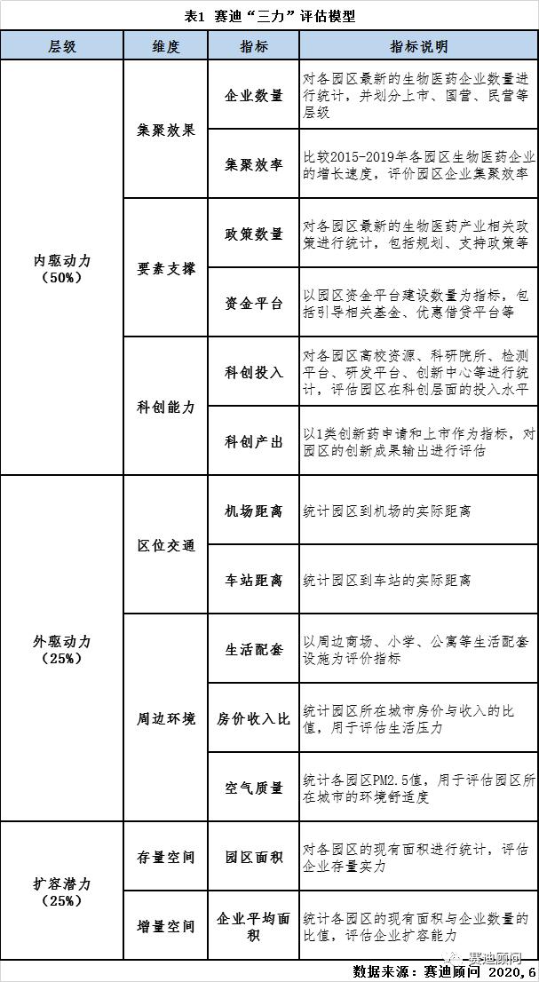 賽迪三力模型能夠從3個(gè)層次6大維度13項(xiàng)指標(biāo)對(duì)生物醫(yī)藥產(chǎn)業(yè)園區(qū)的綜合競(jìng)爭(zhēng)力進(jìn)行評(píng)估,具備全面性、客觀性、準(zhǔn)確性和權(quán)威性。其中,內(nèi)驅(qū)動(dòng)力是園區(qū)發(fā)展最為核心的源動(dòng)力,主要通過(guò)集聚效果、要素支撐、科創(chuàng)能力三個(gè)維度進(jìn)行評(píng)估;外驅(qū)動(dòng)力是園區(qū)發(fā)展的外來(lái)刺激因子,主要涉及區(qū)位交通、周邊環(huán)境兩個(gè)維度;擴(kuò)容潛力主要評(píng)估園區(qū)內(nèi)的企業(yè)飽和度,是園區(qū)未來(lái)空間擴(kuò)展能力的直接體現(xiàn)。