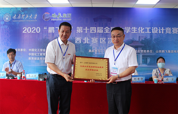 山西鵬飛集團(tuán)有限公司為本次大賽提供了獨(dú)家贊助。為表彰鵬飛集團(tuán)長期以來對(duì)我校人才培養(yǎng)和創(chuàng)新創(chuàng)業(yè)教育的支持,進(jìn)一步促進(jìn)校企合作,學(xué)校授予鵬飛集團(tuán)有限公司“支持大學(xué)生創(chuàng)新創(chuàng)業(yè)教育突出貢獻(xiàn)企業(yè)”榮譽(yù)稱號(hào),劉潤祥在開幕式上為鵬飛集團(tuán)授牌。