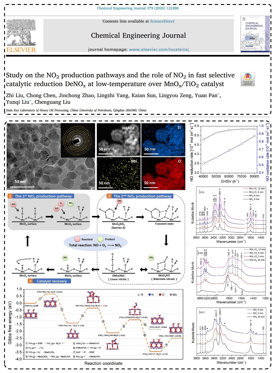 題目為《MnOx/TiO2催化劑上NO2生成路徑及NO2在低溫下快速SCR脫硝反應中的作用機理研究》(Study on the NO2production pathways and the role of NO2in fast selective catalytic reduction DeNOxat low-temperature over MnOx/TiO2catalyst)的研究論文發(fā)表在化工領域權威期刊Chemical Engineering Journal上(Chemical Engineering Journal2020, 379, 122288)。研究人員發(fā)現(xiàn)低溫NH3-SCR反應(NH3+NO+O2→N2+H2O)是NO氧化反應(NO+O2→NO2)與“快速SCR”反應(NH3+NO+NO2→N2+H2O)耦合的結果,NO氧化反應是整個低溫NH3-SCR過程的控速反應。結合原位紅外和密度泛函理論計算等手段,發(fā)現(xiàn)了一種新型二齒硝酸鹽中間產(chǎn)物(*MnO2NO2),并提出了完整的NO催化氧化路徑。該工作為后續(xù)高效低溫NH3-SCR催化劑的設計合成提供了重要思路及理論基礎。