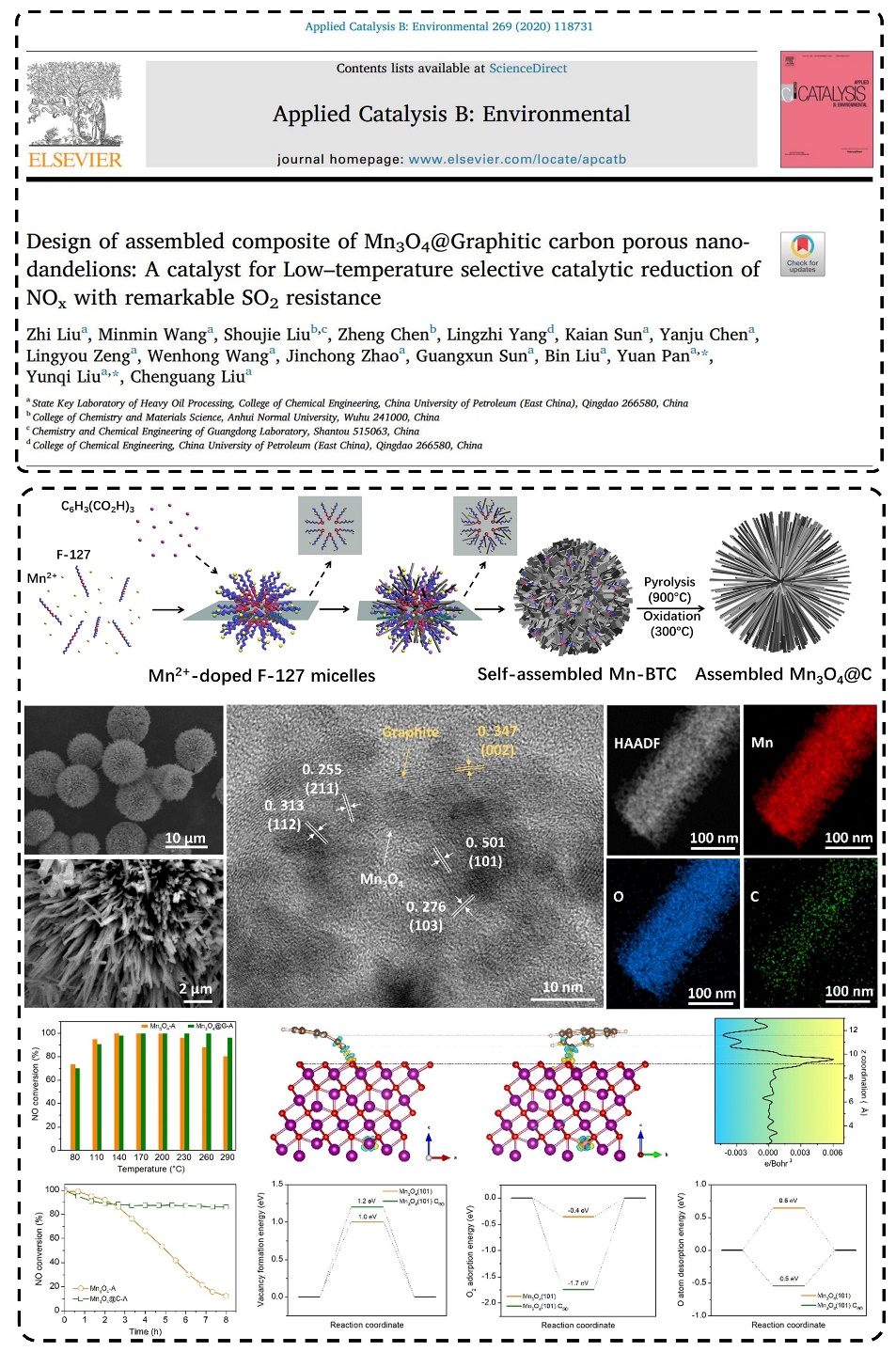 題目為《設計合成自組裝多孔Mn3O4@石墨碳納米蒲公英催化劑:一種具有顯著抗SO2中毒性能的低溫NH3-SCR催化劑》(Design of assembled composite of Mn3O4@Graphitic carbon porous nanodandelions: A catalyst for Low–temperature selective catalytic reduction of NOxwith remarkable SO2resistance)的研究論文發(fā)表在催化領域權威期刊Applied Catalysis B: Environmental上(Applied Catalysis B: Environmental, 2020, 269, 118731)??筍O2中毒性能是抑制錳基催化劑工業(yè)化應用的瓶頸。在對錳基催化反應機理充分認識的基礎下,該工作以錳基金屬有機框架化合物為前驅(qū)物,通過“限域-熱解-氧化”策略,設計合成了新型石墨碳改性的Mn3O4納米顆粒催化劑。該催化劑表現(xiàn)出較高的脫硝活性(在160℃、100 000 h-1下能達到90%以上NO轉(zhuǎn)化率)及顯著提高的抗SO2中毒性能。結合同步輻射X射線吸收光譜及理論計算,揭示了石墨碳在提高催化劑抗SO2中毒性能中的積極作用:電子可以由石墨碳向Mn3O4納米顆粒轉(zhuǎn)移,進而精準調(diào)節(jié)Mn3O4的電荷性質(zhì)及氧化性,Mn3O4納米顆粒適宜的氧化性能夠避免SO2氧化為SO3,進而抑制NH4HSO4生成、提高催化劑抗SO2中毒性能。該工作為設計合成具有高效抗SO2中毒性能的低溫NH3-SCR催化劑提供了新的思路。