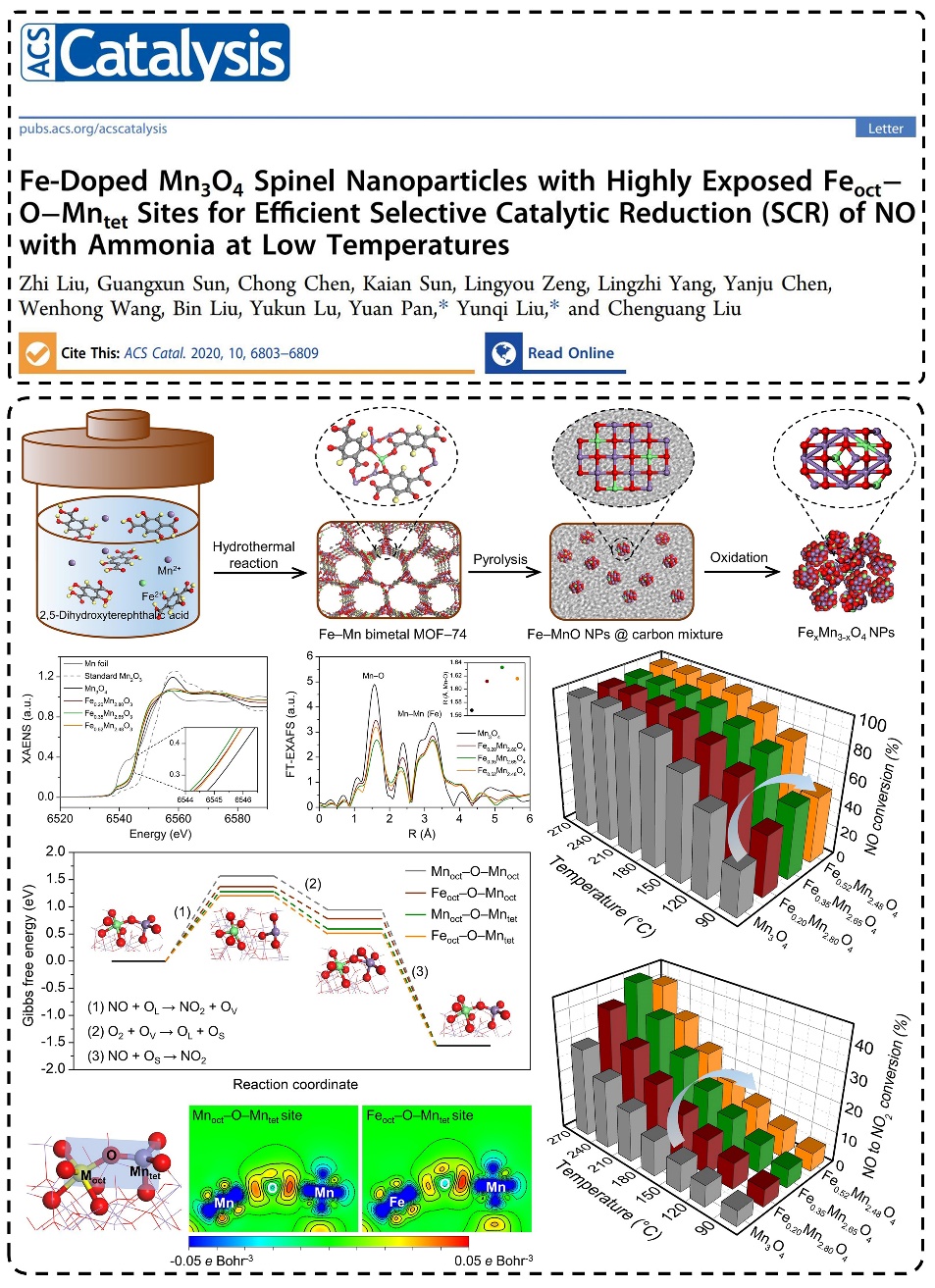 題目為《Feoct?O?Mntet位點高度暴露的Fe摻雜Mn3O4尖晶石納米顆粒催化劑低溫下高效選擇性催化還原氮氧化物》(Fe-doped Mn3O4spinel nanoparticles with highly exposed Feoct?O?Mntetsites for efficient selective catalytic reduction (SCR) of NO with ammonia at low temperatures)的研究論文發(fā)表在催化領域權威期刊ACS Catalysis上(ACS Catalysis, 2020, 10, 6803–6809)?;谇拔膶Φ蜏豊H3-SCR反應機理的研究,NO氧化反應是低溫NH3-SCR過程的關鍵,而氧缺位在金屬氧化物表面氧化反應中起到關鍵作用。鑒于此,本工作旨在采用變價金屬Fe對Mn3O4尖晶石結構精準、均勻摻雜,進而調(diào)控材料Mn-O鍵強度及缺位生成能。傳統(tǒng)制備方法(如:浸漬法、共沉淀法)無法實現(xiàn)Fe–Mn復合氧化物材料的精準控制合成,難以對催化點位和催化活性進行構效關聯(lián),進而導致對本征活性位點認識不足。本工作以Fe–Mn雙金屬有機框架化合物為前驅(qū)物,精準合成了系列Fe/Mn摩爾比可調(diào)的、小尺寸的、組分和形貌均一的Fe–Mn尖晶石催化劑(FexMn3-xO4NPs)。Fe0.35Mn2.65O4NPs催化劑能在180℃、400000 h-1下達到90% NO脫除率?;趯Σ牧系木珳士刂坪铣梢约巴捷椛鋁射線吸收光譜對材料的結構精細解析,建立了Fe–Mn尖晶石材料表面活性位點與NH3-SCR活性之間的構效關系,揭示了具有高本征活性的Feoct–O–Mntet活性位點。同時,結合理論研究發(fā)現(xiàn)催化劑表面氧缺位的生成是NO氧化反應的控速基元反應。Feoct–O–Mntet位點具有最低的氧缺位生成能,這是其高本征活性的根本原因。該工作對低溫NH3-SCR活性點位有了新的認識,并對高效低溫NH3-SCR催化劑的設計合成具有重要指導意義。