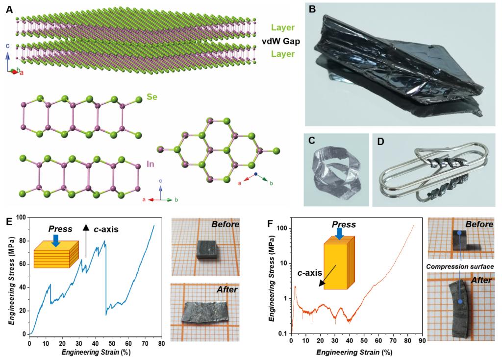 圖1. InSe單晶塊體的超常塑性。(A)晶體結(jié)構(gòu);(B-D)樣品可折疊或彎曲成“紙飛機(jī)”、莫比烏斯環(huán)、螺旋圈等各種形狀而不破裂;(E)沿c軸與(F)垂直c軸方向壓縮的應(yīng)力-應(yīng)變曲線及壓縮前后樣品照片。