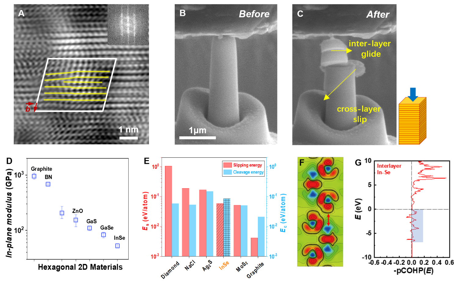 圖2 InSe塑性變形機(jī)制與機(jī)理。(A)刃位錯(cuò)的反傅里葉變換掃描透射暗場像(IFT-DF-STEM);(B-C)掃描電鏡(SEM)下原位壓縮實(shí)驗(yàn),揭示了層間滑動(dòng)與跨層滑移;(D)常見六方結(jié)構(gòu)二維材料的面內(nèi)楊氏模量;(E)滑移能與解理能;(F)差分電荷密度與(G)晶體軌道哈密頓分布密度(COHP),間接佐證了層間長程作用力的存在。