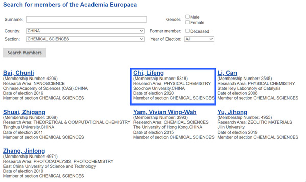 根據(jù)官網(wǎng)公布顯示,截至2020年8月29日,歐洲科學(xué)院共有院士4381位,含化學(xué)科學(xué)領(lǐng)域院士244位,共有43位中國(guó)學(xué)者入選歐洲科學(xué)院外籍院士,其中化學(xué)學(xué)科7位。