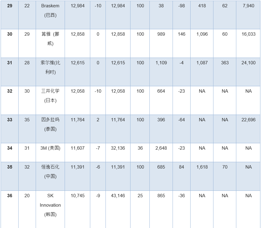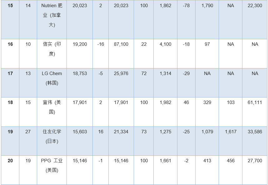 榜單中前五名之外,并購活動繼續(xù)影響排行榜。重組后杜邦公司在榜單上排名第13位,而陶氏杜邦公司(DowDuPont)農(nóng)化業(yè)務剝離成立的科迪華公司(Corteva)首度排名第25位。而都有大量農(nóng)化業(yè)務的拜耳和中國化工排名都高于科迪華公司,中國化工在榜單中居第八,拜耳位居第十二名。2019年也是林德與普萊克斯合并后的第一個全年業(yè)績,新林德公司在排行榜中排名第十,而工業(yè)氣體競爭對手液空集團(Air Liquide)排名第十一位。