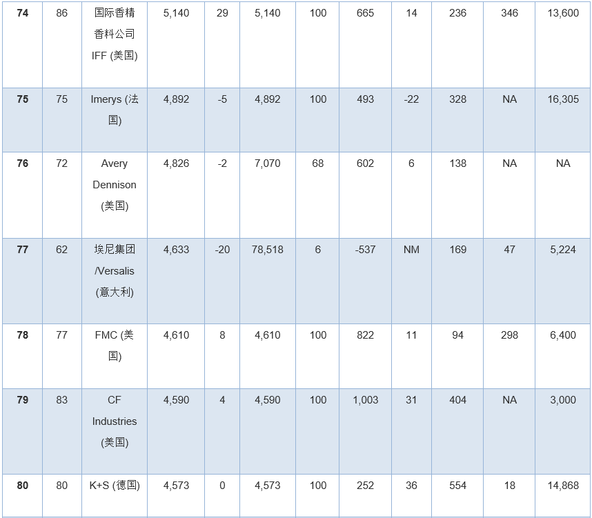 在過去的幾年里,公司并購還對本排行榜產(chǎn)生了另一個影響——入榜公司數(shù)量有所減少。盡管陶氏杜邦公司被拆分為三家,但由于資產(chǎn)剝離等原因歷史上銷售收入達30億美元左右的公司,如亞仕蘭和普立萬,在本年度排名中退至100名以后。