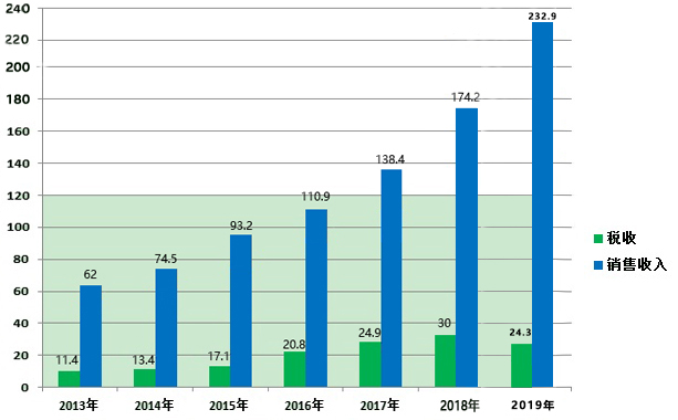 2019年,公司實(shí)現(xiàn)營(yíng)業(yè)收入232.9億元,同比增長(zhǎng)33.7%;稅收24.3億元。