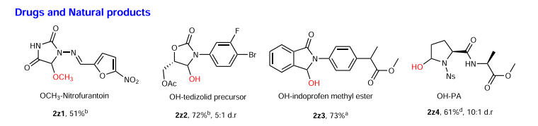 同時(shí),作者還在氮雜環(huán)藥物及多肽修飾方面進(jìn)行了簡(jiǎn)單的嘗試,結(jié)果發(fā)現(xiàn)不論是藥物(呋喃妥因和吲哚洛芬)、藥物前體(特地唑胺)還是多肽,均可通過該方法實(shí)現(xiàn)定點(diǎn)修飾并且得到不錯(cuò)的收率(41%-97%)。