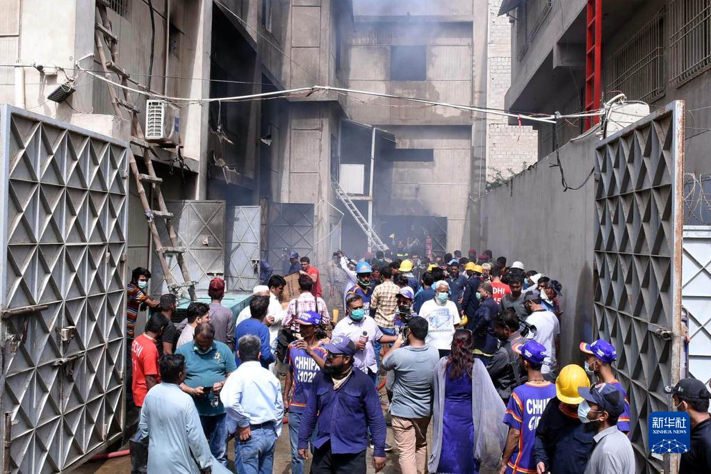 8月27日,救援人員在巴基斯坦卡拉奇的火災現(xiàn)場工作。新華社發(fā)