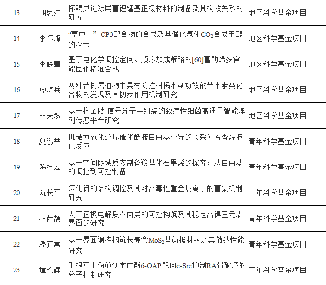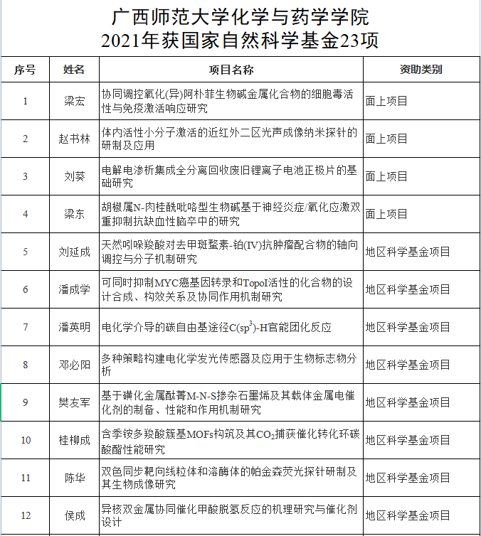 2021年8月18日,國家自然科學(xué)基金委員會公布了2021年國家自然科學(xué)基金項(xiàng)目評審結(jié)果。廣西師范大學(xué)化學(xué)與藥學(xué)學(xué)院共獲批資助23項(xiàng),占全校獲批項(xiàng)目總數(shù)的43.4%,其中面上項(xiàng)目4項(xiàng)(占全校面上項(xiàng)目立項(xiàng)數(shù)的57.1%),地區(qū)科學(xué)基金項(xiàng)目13項(xiàng),青年科學(xué)基金6項(xiàng),是廣西師范大學(xué)化學(xué)與藥學(xué)學(xué)院近五年以來獲得國家自然科學(xué)基金立項(xiàng)數(shù)最多的一年,再創(chuàng)歷史新高。