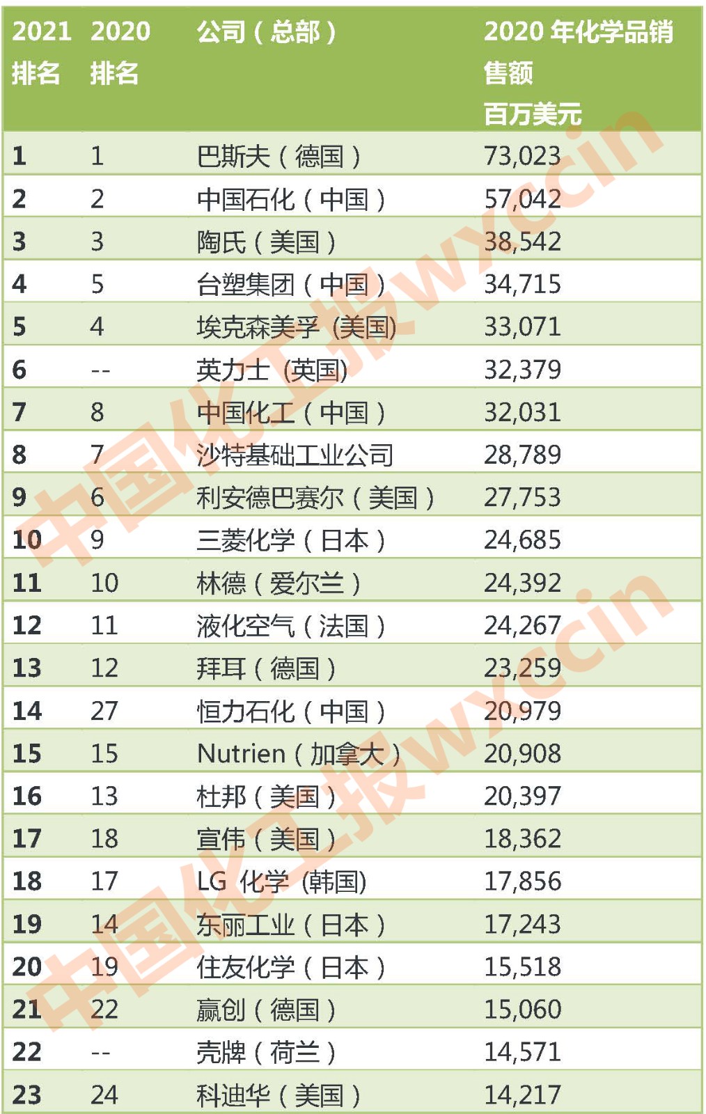 9月13日,美國(guó)《化學(xué)周刊》發(fā)布了最新全球化工公司十億美元俱樂(lè)部排名。按2020年銷售收入計(jì),巴斯夫蟬聯(lián)榜首,中國(guó)石化仍位居第二,陶氏化學(xué)名列第三。