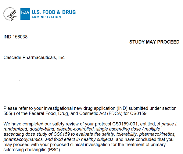 2021年10月20日,I類新藥CS0159口服片劑針對(duì)原發(fā)性硬化性膽管炎(PSC)適應(yīng)癥的臨床試驗(yàn)申請(qǐng)(IND)獲得美國食品藥品監(jiān)督管理局(FDA)批準(zhǔn)。