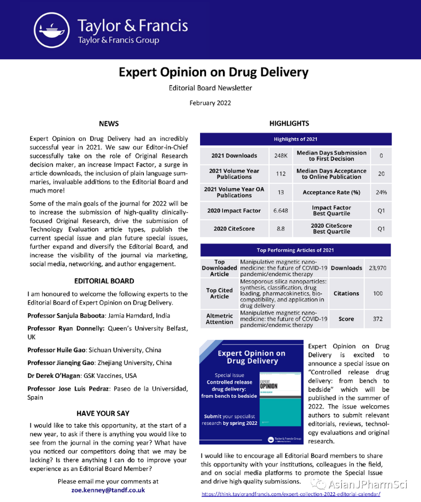 Expert Opinion on Drug Delivery于2004年創(chuàng)刊,是藥物遞送領(lǐng)域的經(jīng)典期刊。該雜志是MEDLINE索引的同行評審期刊,2020年影響因子為6.648。收錄的文章涵蓋藥物輸送研究的各個方面,從最初的概念到潛在的治療應(yīng)用和臨床使用的最終相關(guān)性。該雜志區(qū)別于其他雜志的特點在于每篇文章都應(yīng)結(jié)合作者自己對相關(guān)領(lǐng)域的現(xiàn)狀和發(fā)展范圍的提出專家意見,從而為讀者提供更多的思考。