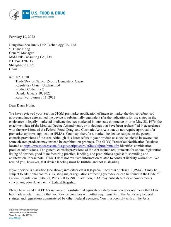 杭州沸創(chuàng)的專(zhuān)利產(chǎn)品沸石止血紗布(Zeolite Hemostatic Gauze),于2022年2月10日已通過(guò)美國(guó)FDA 510k醫(yī)療器械認(rèn)證(k211570),獲得在美上市資格,可在美國(guó)及認(rèn)可美國(guó)FDA的國(guó)家和地區(qū)進(jìn)行銷(xiāo)售。作為杭州沸創(chuàng)生命科技股份有限公司的核心創(chuàng)新醫(yī)療器械產(chǎn)品,沸石止血紗布一直以來(lái)備受公司重視和外界的關(guān)注,在獲批美國(guó)FDA 510k認(rèn)證之前,該產(chǎn)品已經(jīng)于2021年01月25日獲國(guó)內(nèi)II類(lèi)創(chuàng)新醫(yī)療器械注冊(cè)證。(浙械注準(zhǔn)20212140037)。公司創(chuàng)始人為浙江大學(xué)化學(xué)系范杰教授。