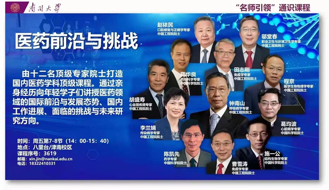 著眼全球生物醫(yī)藥前沿趨勢(shì),醫(yī)學(xué)院于本學(xué)期正式開(kāi)設(shè)由12位院士主講的《醫(yī)藥前沿與挑戰(zhàn)》通識(shí)選修課,該課程由曹雪濤負(fù)責(zé),面向南開(kāi)大學(xué)和天津醫(yī)科大學(xué)本科生開(kāi)放,目標(biāo)是打造國(guó)內(nèi)醫(yī)藥學(xué)科頂級(jí)課程。