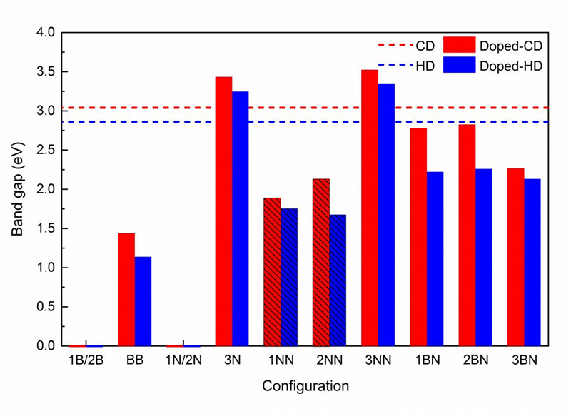 圖3. 不同摻雜構(gòu)型的帶隙。單色的柱狀表示直接帶隙,有斜線的柱狀表示間接帶隙。紅色虛線和藍色虛線分別表示純的立方金剛石烯和六方金剛石烯的帶隙