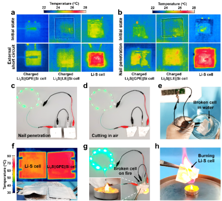 圖3. 基于硫化鋰正極、硅負(fù)極與耐火阻燃聚合物凝膠電解質(zhì)的準(zhǔn)固態(tài)電池安全性評價(jià)