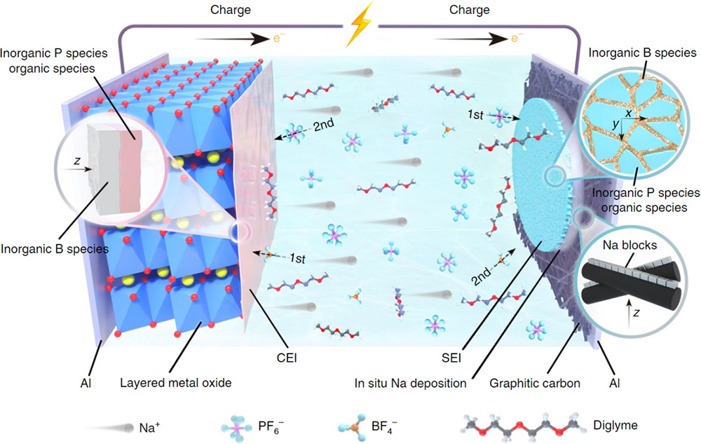 實(shí)現(xiàn)該類電池高比能與長循環(huán)壽命的關(guān)鍵在于正極、集流體與電解液側(cè)的綜合性設(shè)計(jì)。在正極側(cè),該研究選取了不含鈷的銅基O3相層狀氧化物,保證電池高能量密度的同時(shí)具有低成本和可持續(xù)性。為了實(shí)現(xiàn)自下而上較為平滑的金屬鈉沉積,在負(fù)極集流體側(cè)選用石墨化碳涂層使鈉離子具有較低的形核過電勢,控制金屬鈉以較小尺寸均勻密集形核。然而,研究發(fā)現(xiàn)即使用該親鈉型集流體涂層,傳統(tǒng)的醚類電解液中沉積的金屬鈉表面依然存在裂紋,裂紋會(huì)不斷與電解液發(fā)生反應(yīng)消耗活性金屬鈉,并導(dǎo)致后續(xù)循環(huán)中不均勻的鈉沉積甚至鈉枝晶形成。為了進(jìn)一步解決上述界面破裂問題,該研究設(shè)計(jì)了一款含硼鹽的電解液,利用多尺度的界面表征技術(shù)捕捉到其分解產(chǎn)物在負(fù)極(SEI)及正極(CEI)界面處均形成了非晶態(tài)固體電解質(zhì)中間相,并且硼-氧組分在負(fù)極側(cè)界面膜的外層呈現(xiàn)二維分布,而在正極側(cè)界面膜的內(nèi)層呈現(xiàn)三維分布?;诹孔踊瘜W(xué)/分子動(dòng)力學(xué)模擬發(fā)現(xiàn)添加了硼鹽后的電解液具有特殊的溶劑化構(gòu)型進(jìn)而影響在正負(fù)極側(cè)的分解順序,合理地解釋了這種含硼組分在正負(fù)極側(cè)異質(zhì)分布的奇異現(xiàn)象。堅(jiān)固且柔性的SEI膜有效地抑制了死鈉及鈉枝晶的形成,修復(fù)了金屬鈉沉積和剝離過程中形成的裂紋,而超薄的CEI膜則保護(hù)了正極的結(jié)構(gòu)完整性并阻礙過渡金屬離子溶解。