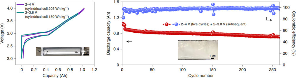 得益于上述三重的協(xié)同界面(集流體/鈉界面、鈉/電解液界面和電解液/正極界面)效應(yīng),實(shí)現(xiàn)了高度可逆的金屬鈉沉積(富有金屬光澤),并且組裝的Ah級(jí)別的圓柱型鈉離子電池在不施加額外壓力及非高溫循環(huán)的情況下循環(huán)壽命可達(dá)260次。這項(xiàng)工作中關(guān)于本征鈉沉積/剝離行為(不同于鋰金屬沉積)和界面化學(xué)的見解為進(jìn)一步開發(fā)更高性能的鈉離子電池提供了寶貴的思路。