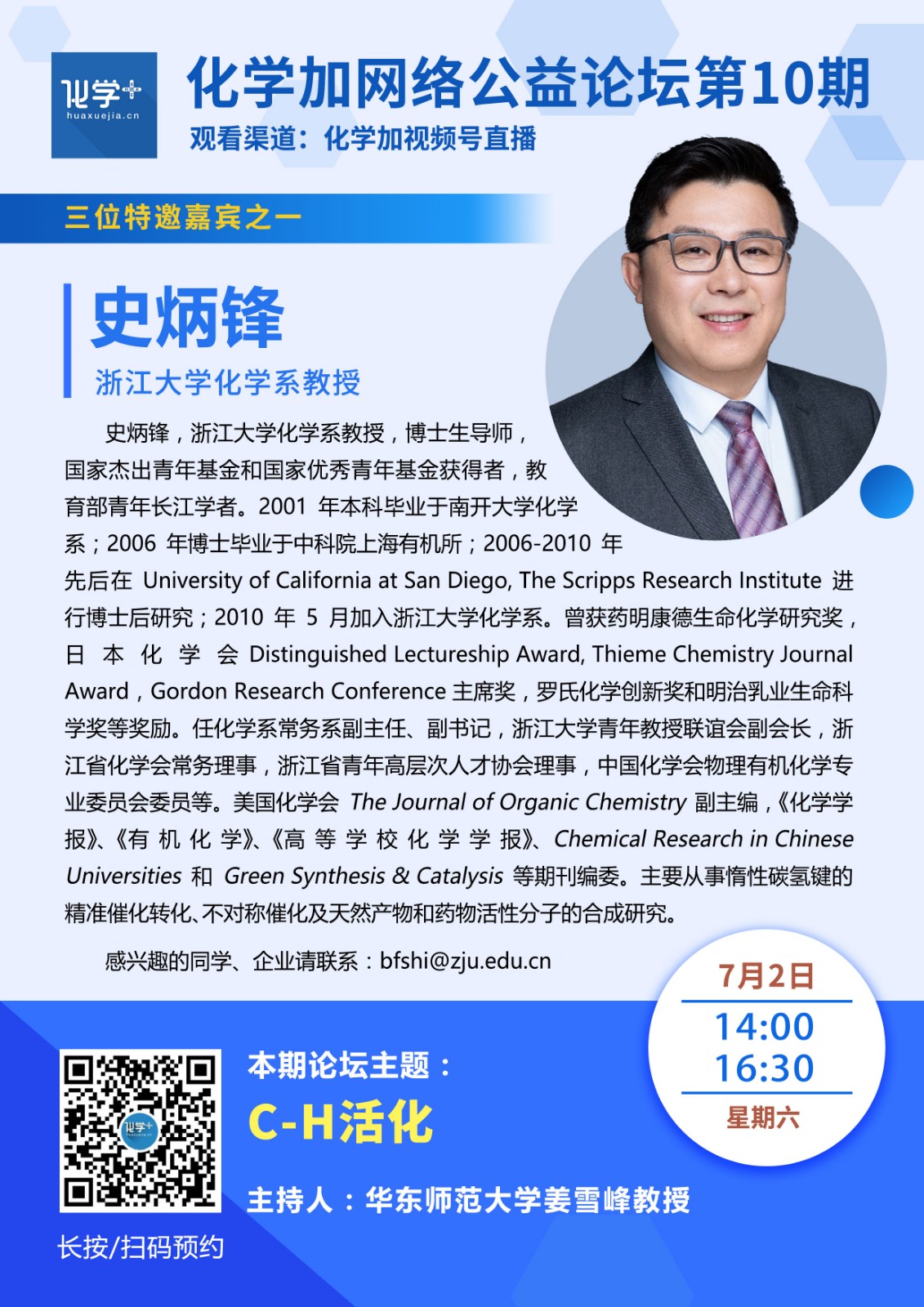 史炳鋒,浙江大學化學系教授,博士生導師,國家杰出青年基金和國家優(yōu)秀青年基金獲得者,教育部青年長江學者。2001年本科畢業(yè)于南開大學化學系;2006年博士畢業(yè)于中科院上海有機所;2006-2010年先后在University of California at San Diego, The Scripps Research Institute進行博士后研究;2010年5月加入浙江大學化學系。曾獲藥明康德生命化學研究獎,日本化學會Distinguished Lectureship Award, Thieme Chemistry Journal Award,Gordon Research Conference主席獎,羅氏化學創(chuàng)新獎和明治乳業(yè)生命科學獎等獎勵。任化學系常務系副主任、副書記,浙江大學青年教授聯(lián)誼會副會長,浙江省化學會常務理事,浙江省青年高層次人才協(xié)會理事,中國化學會物理有機化學專業(yè)委員會委員等。美國化學會The Journal of Organic Chemistry副主編,《化學學報》、《有機化學》、《高等學?;瘜W學報》、Chemical Research in Chinese Universities和Green Synthesis & Catalysis等期刊編委。主要從事惰性碳氫鍵的精準催化轉化、不對稱催化及天然產(chǎn)物和藥物活性分子的合成研究。