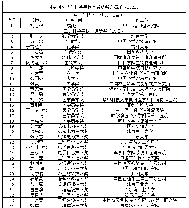 劉鶴副總理為何梁何利基金科學與技術成就獎獲獎人胡思得、林鳴頒獎并合影,胡思得和林鳴院士代表獲獎科學家發(fā)言。教育部、科技部、中科院、工程院、國防科工局、自然科學基金委、中央軍委科技委和中國科協(xié)等部門領導同志,獲獎人以及有關方面代表約150人參加大會。