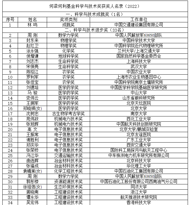 2021和2022年度何梁何利基金科學與技術獎共授予112名杰出科技工作者。何梁何利基金最高獎項——何梁何利基金科學與技術成就獎,授予中國工程物理研究院胡思得院士和中國交通建設集團有限公司林鳴院士。胡思得院士長期從事理論研究設計工作,先后參加或主持領導了多項試驗,創(chuàng)造性地解決了一系列關鍵技術問題;在軍控核查領域,為國家安全利益提供了重要對策建議,為我國國防建設作出重要貢獻。林鳴院士攻克了外海島隧工程多項世界級難題,形成了具有自主知識產權的跨海沉管隧道建造技術體系;主持建成我國首條、世界最長的跨海公路沉管隧道,為我國公路沉管隧道趕超國際領先水平作出重要貢獻。何梁何利基金科學與技術進步獎授予66位在數(shù)學力學、生命科學、工程技術等領域取得重大科學發(fā)現(xiàn),或作出突出貢獻的優(yōu)秀科技工作者。何梁何利基金科學與技術創(chuàng)新獎下設青年創(chuàng)新獎、產業(yè)創(chuàng)新獎、區(qū)域創(chuàng)新獎三大類,共授予44位優(yōu)秀科技工作者。