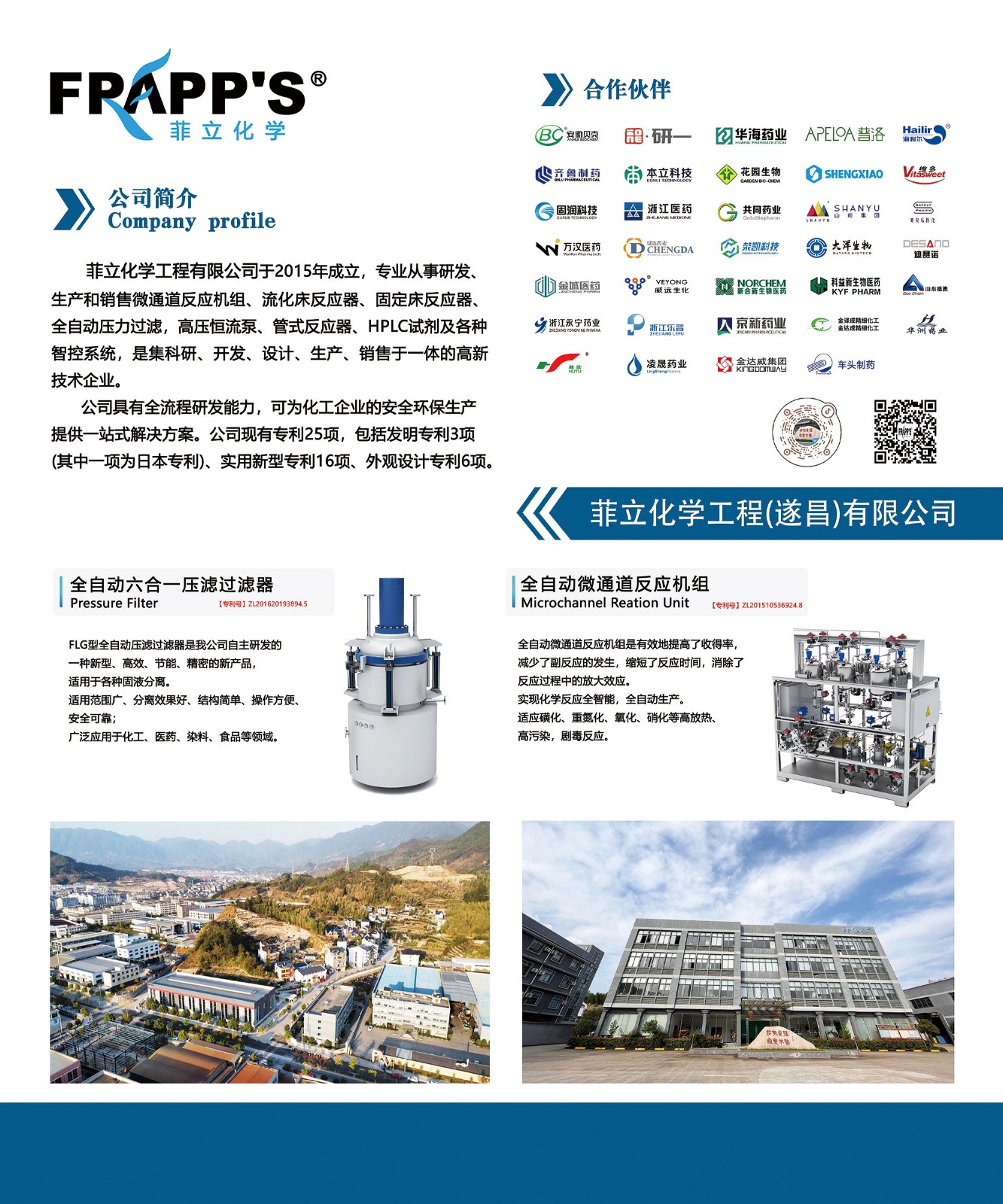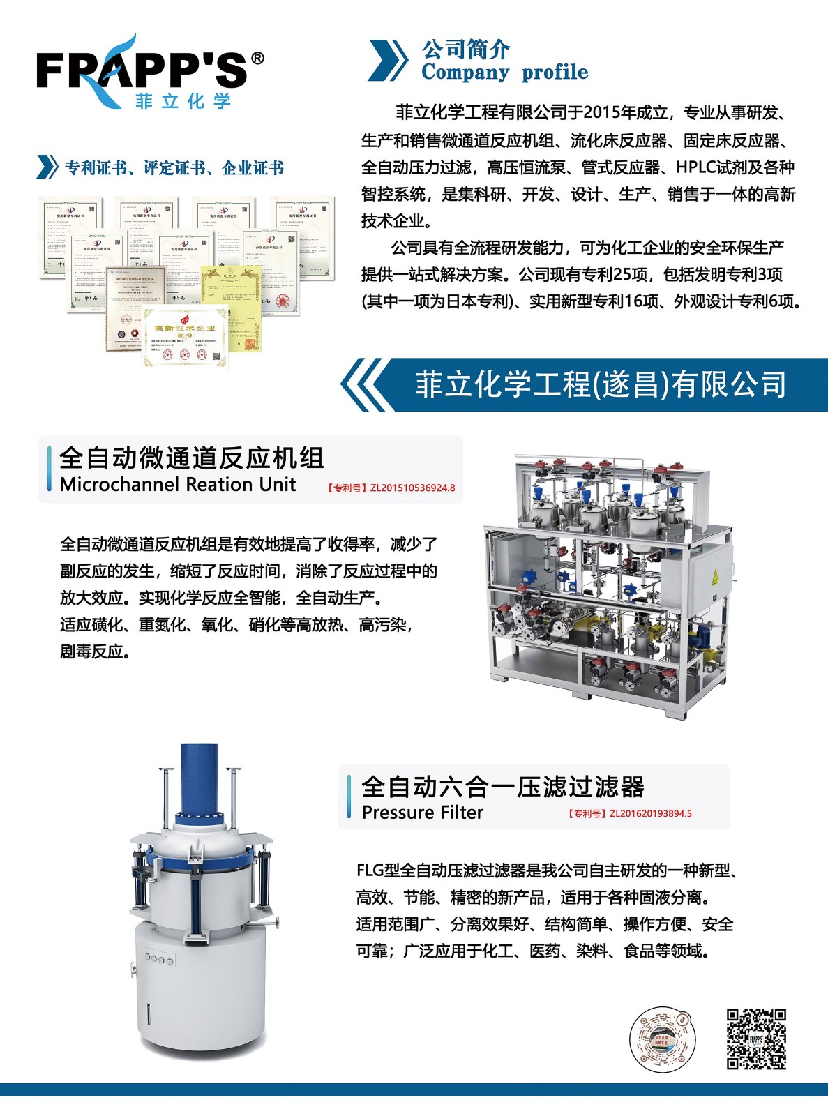 菲立化學工程有限公司于2015年成立,專業(yè)從事研發(fā)、生產(chǎn)和銷售微通道反應(yīng)機組、流化床反應(yīng)器、固定床反應(yīng)器、全自動壓力過濾,高壓恒流泵、管式反應(yīng)器、HPLC試劑及各種智控系統(tǒng),是集科研、開發(fā)、設(shè)計、生產(chǎn)、銷售于一體的高新技術(shù)企業(yè)。