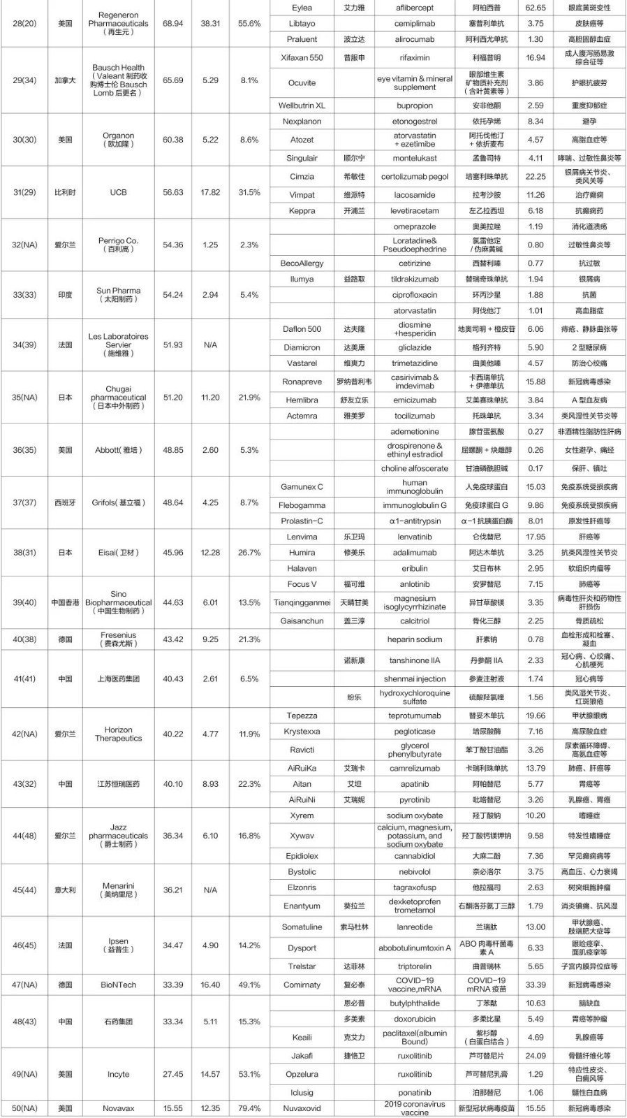 資料顯示,2023年的50強與2022年相比有些許變化。原50強企業(yè):美國亞力兄(2022年42位)被阿斯利康收購并表后徹底消失,而住友日本制藥(2022年36位)、印度阿拉賓度(2022年46位)、德國Stada(史達德)(2022年47位)、愛爾蘭Endo International(遠藤國際制藥)(2022年49位)和日本協(xié)和麒麟(2022年50位)等5家企業(yè)跌出榜單,住友日本制藥估計是統(tǒng)計遺漏的原因,就像今年第35名的日本中外制藥,去年也沒有進入榜單,今年又突然冒了出來。后面原先排在榜單末尾的4家更多可能會受匯率的影響,但是相信會比今年的第50名美國Novavax的15.55億美元要高。6家企業(yè)新進入50強,分別是首次進入榜單的愛爾蘭百利高(第32名)、去年估計遺漏而今年再次進入榜單的日本中外制藥(第35名)、首次進入榜單的愛爾蘭Horizon Therapeutics(地平線治療)(第42名)、首次進入榜單的靠新冠疫苗銷售的德國BioNTech(第47名)、首次進入榜單的美國Incyte(第49名)和美國Novavax(第50名),愛爾蘭百利高是一家總部設(shè)在愛爾蘭都柏林的跨國化學(xué)仿制藥生產(chǎn)公司,有處方藥和OTC藥及特殊藥品,2023年估計是參與了評選,未來有業(yè)務(wù)數(shù)據(jù)細分后的OTC藥被剔除統(tǒng)計而跌出榜單的可能。日本中外制藥一直是50強榜單的??停ツ旯烙嫿y(tǒng)計遺漏而今年再次進入榜單,曾位列2021年第41位,2020年第40位,2019年的第39位,2018年和2017年的第37位,2016年和2015年的第38位,2014年的第36位,2013年的第33位,2011年的第26位和2010年的第27位。愛爾蘭Horizon Therapeutics(地平線治療)是一家總部位于愛爾蘭都柏林的全球生物技術(shù)公司,專注于治療罕見,自身免疫和嚴重炎癥性疾病的藥物,在2022年12月安進宣布將以278億美元收購愛爾蘭Horizon Therapeutics,但2023年5月受到了美國聯(lián)邦貿(mào)易委員會(FTC)的訴訟,擬阻止交易的達成,如果收購達成,則首次進入榜單的Horizon Therapeutics將在明年的榜單中消失。首次進入榜單的德國BioNTech是僅靠一款新冠疫苗進入50強的專注于mRNA疫苗的企業(yè),BioNtech獨自負責(zé)復(fù)必泰(Comirnaty)在德國和土耳其區(qū)域的銷售就獲得了33.39億美元,而輝瑞與之合作負責(zé)其它地區(qū)的銷售。美國Incyte是一家2002年最初由一群科學(xué)家創(chuàng)立并逐步發(fā)展成全球性的生物制藥公司,致力于新藥的發(fā)現(xiàn)與開發(fā),主攻腫瘤、炎癥和自身免疫方向,其有第一個批準的JAK1/JAK2抑制劑。美國Novavax是一家1986年成立并以重組納米顆粒技術(shù)生產(chǎn)重組蛋白疫苗的生物技術(shù)公司,重組蛋白疫苗Nuvaxovid是其首個上市產(chǎn)品,但因管理層決策、產(chǎn)能限制等因素而一拖再拖,距離Moderna和BioNtech的新冠mRNA疫苗上市已遲到了一年多的時間,錯過了“黃金期”。