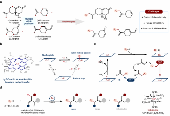 基于前期工作基礎(chǔ)(Nature Catal., 2022, 5, 642),雷愛文教授團(tuán)隊(duì)設(shè)想結(jié)合維生素B12催化的烷基轉(zhuǎn)移與鈷促進(jìn)的氫原子轉(zhuǎn)移過程來避免碳正離子消除的路徑,從而實(shí)現(xiàn)烯丙位的精準(zhǔn)氟烷基化。利用親核性的一價(jià)鈷與親電性的氟烷基試劑反應(yīng)產(chǎn)生氟烷基自由基,隨后氟烷基自由基與烯烴反馬氏加成,在鈷肟催化劑的氫原子轉(zhuǎn)移作用下得到烯丙位氟烷基化產(chǎn)物。基于鈷肟HAT的選擇性,這一策略對(duì)于多種萜烯都展示出了單一的區(qū)域選擇性。
