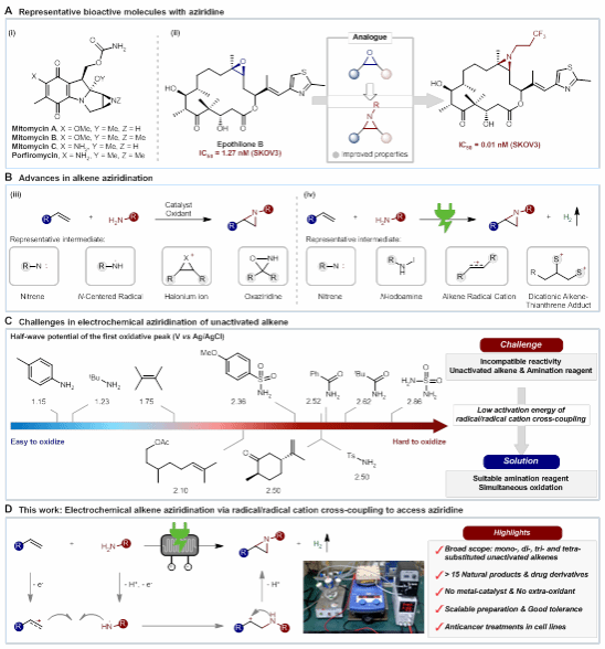 1. 電賦能物質(zhì)轉(zhuǎn)化:流動(dòng)電化學(xué)實(shí)現(xiàn)不活潑烯烴氮雜環(huán)丙烷化