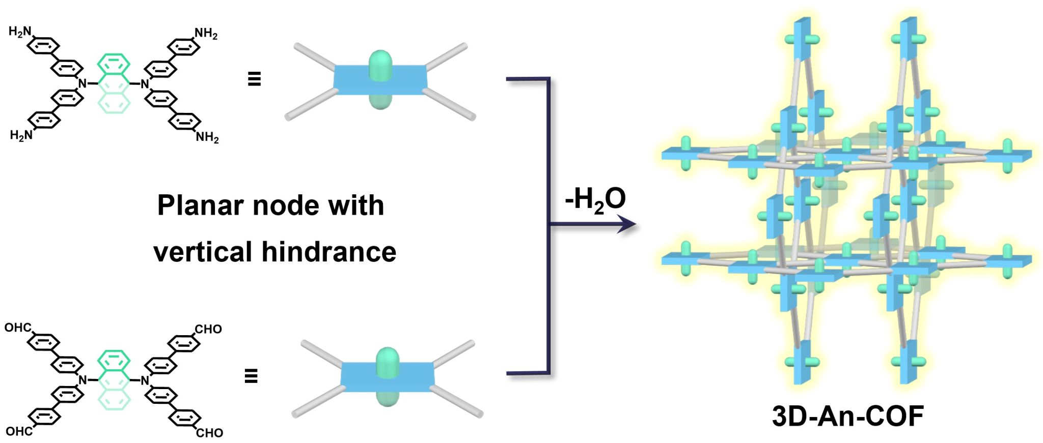 一種可行的解決方案是在平面分子的垂直方向引入大體積位阻基團(tuán),利用位阻基團(tuán)之間的排斥抑制層間堆積,進(jìn)而通過二維片層穿插構(gòu)筑三維COF。為證明該策略的可行性,他們將具有大位阻的蒽單元引入分子前體,設(shè)計(jì)并合成了兩個(gè)在垂直方向具有蒽單元的平面分子,并進(jìn)一步構(gòu)筑了具有良好結(jié)晶性的三維COF(3D-An-COF)。結(jié)構(gòu)解析顯示,3D-An-COF由二維片層通過近乎垂直的角度穿插而成,是一種全新的三維COF。此外,蒽單元的引入賦予該COF良好的熒光性能,可用于水相中抗生素的高效檢測。此研究提供了一種三維COF的新型構(gòu)筑策略,有助于豐富三維COF的結(jié)構(gòu)多樣性,推動功能化三維COF的發(fā)展和應(yīng)用。