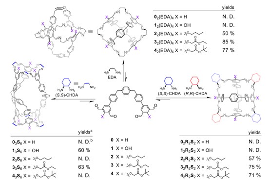 首先,作者將前體1與(S,S)-CHDA(環(huán)己烷二胺)在CDCl3中以1:2的比例縮合,體系選擇性地獲得了[3+6]共價(jià)籠,即由3個(gè)當(dāng)量的1和6個(gè)當(dāng)量的(S,S)-CHDA組成。產(chǎn)物的選擇性來(lái)源于分子內(nèi)氫鍵的驅(qū)動(dòng)力:空間位阻的存在使得亞胺質(zhì)子盡可能的與環(huán)己烷橋頭的質(zhì)子成順式構(gòu)象,而(S,S)-CHDA的兩個(gè)橋頭質(zhì)子為反式構(gòu)象,這就要求同一個(gè)環(huán)己烷二胺連接的兩個(gè)亞胺質(zhì)子為反式構(gòu)象。而前體1中含有一個(gè)羥基,后者的氧原子和質(zhì)子分別與兩邊的亞胺質(zhì)子和亞胺氮原子形成氫鍵,使得同一個(gè)苯環(huán)上的兩個(gè)亞胺鍵成endo-exo(內(nèi)-外)構(gòu)象,這一構(gòu)象剛好可以使同一環(huán)己烷相連的亞胺質(zhì)子處于反式,這種情況下的[3+6]共價(jià)籠是最穩(wěn)定的。