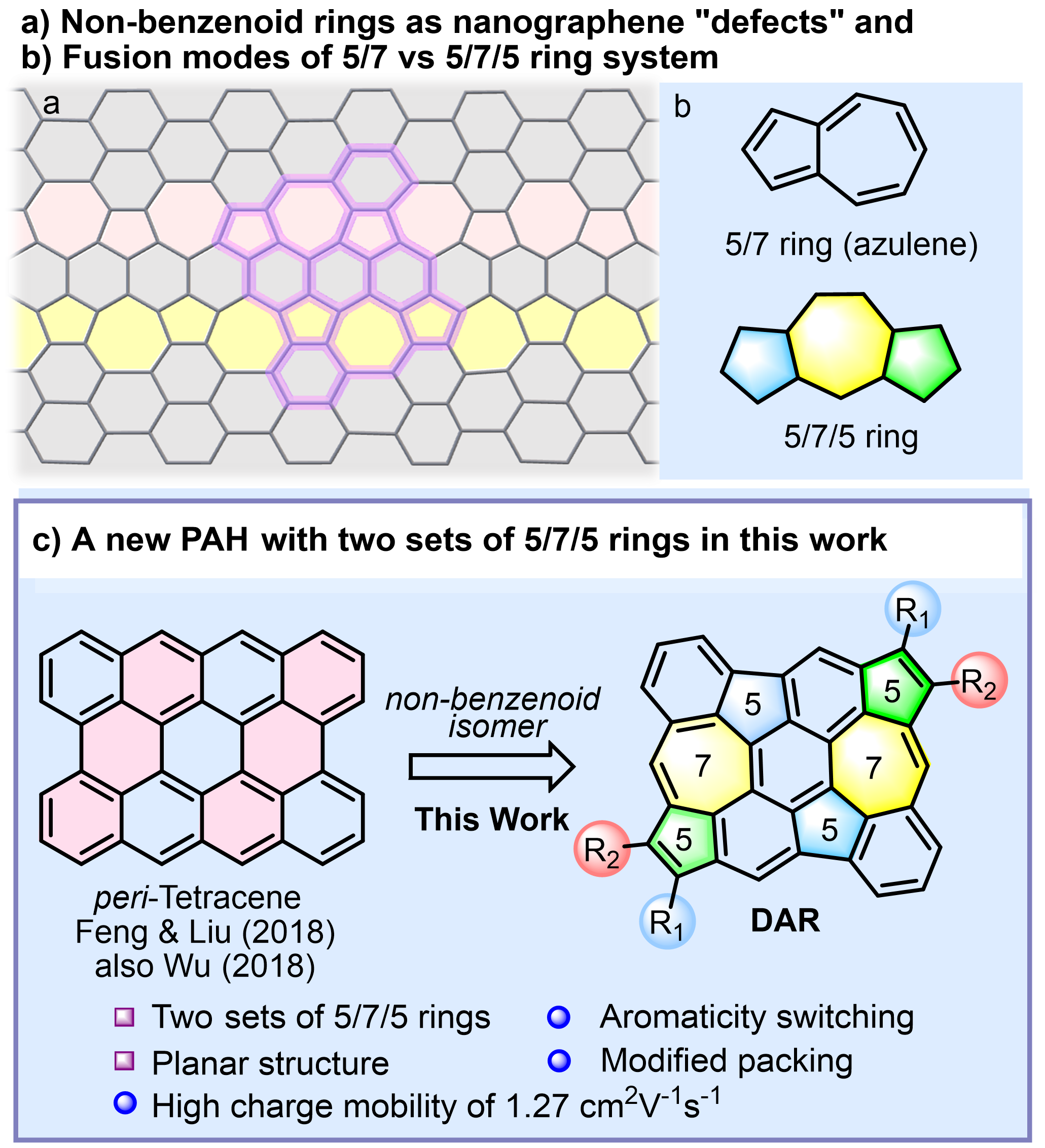 在國家自然科學(xué)基金委、科技部、中國科學(xué)院、北京分子科學(xué)國家研究中心等項(xiàng)目的支持下,張德清課題組在前期研究中同時(shí)將五元環(huán)和七元環(huán)(形式上的薁單元)引入共軛分子,通過五元環(huán)和七元環(huán)之間的“互補(bǔ)效應(yīng)”,構(gòu)造出了具有平面結(jié)構(gòu)的非苯型二維共軛分子DHR。該分子的薄膜和晶體表現(xiàn)出p-型半導(dǎo)體性能,其空穴遷移率達(dá)到0.082 cm2v-1s-1(Angew. Chem. Int. Ed. 2020, 59, 3529-3533)。為了進(jìn)一步研究五元環(huán)/七元環(huán)“缺陷”對(duì)分子的結(jié)構(gòu)和性能的影響,該課題組發(fā)展了新的稠合模式,合成了含有5/7/5環(huán)系的二維大共軛分子二薁并玉紅省(DAR),它可以看作是蒽環(huán)被5/7/5環(huán)取代的peri-并四苯的非苯型異構(gòu)體(圖1)?;贒HR,他們發(fā)展了鈀催化的C-H鍵活化/(3+2)環(huán)化反應(yīng),構(gòu)建了5/7/5環(huán)系,合成了一系列DAR分子。該反應(yīng)具有良好的底物適用范圍。鍵長(zhǎng)分析和理論計(jì)算(NICS)研究表明五元環(huán)的稠合對(duì)分子的電子結(jié)構(gòu)產(chǎn)生了明顯的影響。相比于前體分子DHR,在分子DAR中新形成的五元環(huán)(A環(huán))為芳香性,原來的七元環(huán)(E環(huán))由弱的反芳香性轉(zhuǎn)變?yōu)榉欠枷阈?,原來的五元環(huán)(C’環(huán))由芳香性轉(zhuǎn)變?yōu)槿醯姆捶枷阈?。該分子在可見光區(qū)具有多重(8重)吸收特征。單晶結(jié)構(gòu)顯示該分子具有平面構(gòu)型,其中取代基位阻較小分子DAR-TMS的分子間相互作用較強(qiáng),是潛在的半導(dǎo)體傳輸材料,其單晶最高載流子遷移率達(dá)到1.27 cm2V-1s-1。這是含有七元環(huán)的非苯型共軛分子體系中較高的遷移率,證明5/7/5環(huán)系的引入是提升分子的半導(dǎo)體性能的有效途徑。該工作為研究非苯型環(huán)對(duì)分子的性能的影響、設(shè)計(jì)高遷移率非苯型半導(dǎo)體材料提供了思路。相關(guān)研究成果發(fā)表在Angew. Chem. Int. Ed. 2023, 62, e202304632,第一作者是博士生秦麗園和黃雁鷹博士,通訊作者是張德清研究員和張西沙副研究員。