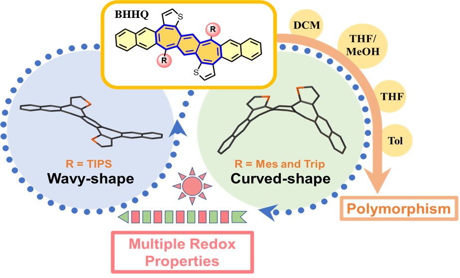 分子的構(gòu)象動(dòng)態(tài)多變性是含有七元環(huán)的共軛分子的重要特征之一,調(diào)控分子的構(gòu)象和動(dòng)態(tài)變化可以豐富其性能。張德清課題組合成了一類含醌式7/6/7環(huán)系的并七苯類似物(BHHQ),通過取代基策略和結(jié)晶條件誘導(dǎo)策略實(shí)現(xiàn)了分子的構(gòu)型從波浪(wavy)到彎曲(curved)的調(diào)控和互變,并且探索了該分子在溶劑氛圍響應(yīng)方面的應(yīng)用(圖2)。研究人員通過Aldo縮合反應(yīng)和Diels-Alder反應(yīng)等5步反應(yīng)高效、簡(jiǎn)潔的實(shí)現(xiàn)了一系列七元環(huán)上連接不同取代基的并七苯類似物(BHHQs)。研究發(fā)現(xiàn)取代基的大小能夠調(diào)控分子的構(gòu)型。三異丙基硅基乙炔(CC-TIPS)取代的化合物BHHQ-TIPS表現(xiàn)為波浪(wavy)構(gòu)型,而大位阻的三異丙基苯基(Trip)取代的化合物BHHQ-Trip表現(xiàn)出彎曲(curved)構(gòu)型。均三甲基苯基(Mes)取代的化合物BHHQ-Mes則表現(xiàn)出特殊的多晶型現(xiàn)象。通過改變結(jié)晶條件能夠得到五種不同構(gòu)型的多晶型A-E,實(shí)現(xiàn)了從較大程度的彎曲(curved)構(gòu)型,逐漸過渡到較小程度的彎曲(curved)構(gòu)型,再到波浪(wavy)構(gòu)型。BHHQ柔性的共軛骨架與溶劑分子之間強(qiáng)的相互作用還使得化合物BHHQ-Mes表現(xiàn)出特殊的溶劑響應(yīng)現(xiàn)象,在不同溶劑氛圍下熏蒸能夠?qū)崿F(xiàn)微晶固體顏色從亮黃色到深紅色的轉(zhuǎn)變,對(duì)應(yīng)的最大吸收波長(zhǎng)從478 nm紅移至501 nm。此外,BHHQ還表現(xiàn)出豐富的氧化還原特性?;衔顱HHQ-Mes能夠在NOSbF6的氧化下生成陽離子自由基或二價(jià)陽離子,在KC8的還原下生成一價(jià)陰離子自由基1c·-。同中性態(tài)相比,1c·-中心六元環(huán)的芳香性增強(qiáng),構(gòu)型從彎曲(curved)轉(zhuǎn)變?yōu)椴ɡ耍╳avy)。相關(guān)研究成果發(fā)表在Angew. Chem. Int. Ed. 2023, 62, e202300990,第一作者是黃雁鷹博士,通訊作者是張德清研究員和張西沙副研究員。