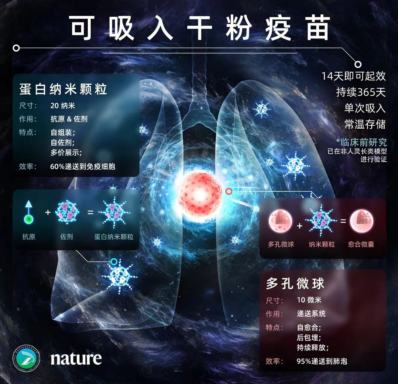 中國科學(xué)院院士、過程工程所生化工程國家重點(diǎn)實(shí)驗(yàn)室主任馬光輝及研究員魏煒團(tuán)隊(duì)基于多年均一微球制備及生物劑型工程的研究基礎(chǔ),提出了納微復(fù)合遞送新理念,并與軍事醫(yī)學(xué)研究院生物工程研究所研究員王恒樑及朱力團(tuán)隊(duì)合作,開發(fā)了具有“納微復(fù)合”多級結(jié)構(gòu)的單劑干粉吸入式疫苗研制平臺技術(shù),可實(shí)現(xiàn)多種蛋白抗原疫苗的開發(fā)與迭代。目前已在實(shí)驗(yàn)室成功制備出新型干粉吸入式疫苗,且在動物模型上顯示出能夠高效阻斷呼吸道病毒的感染與傳播。相關(guān)工作于12月14日發(fā)表在《自然》(Nature)上(DOI:10.1038/s41586-023-06809-8)。