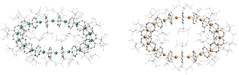 日本沖繩科學(xué)技術(shù)研究所與德國(guó)和俄羅斯的科學(xué)家攜手,通過(guò)將18個(gè)茂金屬單元彎曲成一個(gè)納米級(jí)的環(huán),制成了一種新型的超大夾層復(fù)合物環(huán)烯。他們將金屬鍶、釤或銪等夾在環(huán)辛四烯層之間,龐大的三異丙基甲硅烷取代基迫使茂金屬在堆疊時(shí)彎曲成環(huán),制成了這些環(huán)烯。