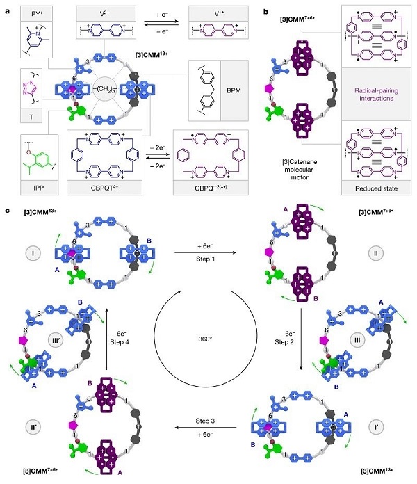 現(xiàn)今大多數(shù)分子馬達(dá)由化學(xué)燃料或光驅(qū)動(dòng),但來(lái)自美國(guó)西北大學(xué)、加州理工學(xué)院、緬因大學(xué)的聯(lián)合研究團(tuán)隊(duì)歷時(shí)4年,設(shè)計(jì)并合成了一種基于索烴的電動(dòng)分子馬達(dá)。在溶液中,索烴兩個(gè)較小環(huán)可沿較大的環(huán)進(jìn)行電驅(qū)動(dòng)單向旋轉(zhuǎn)運(yùn)動(dòng),整個(gè)過(guò)程不產(chǎn)生廢棄物。