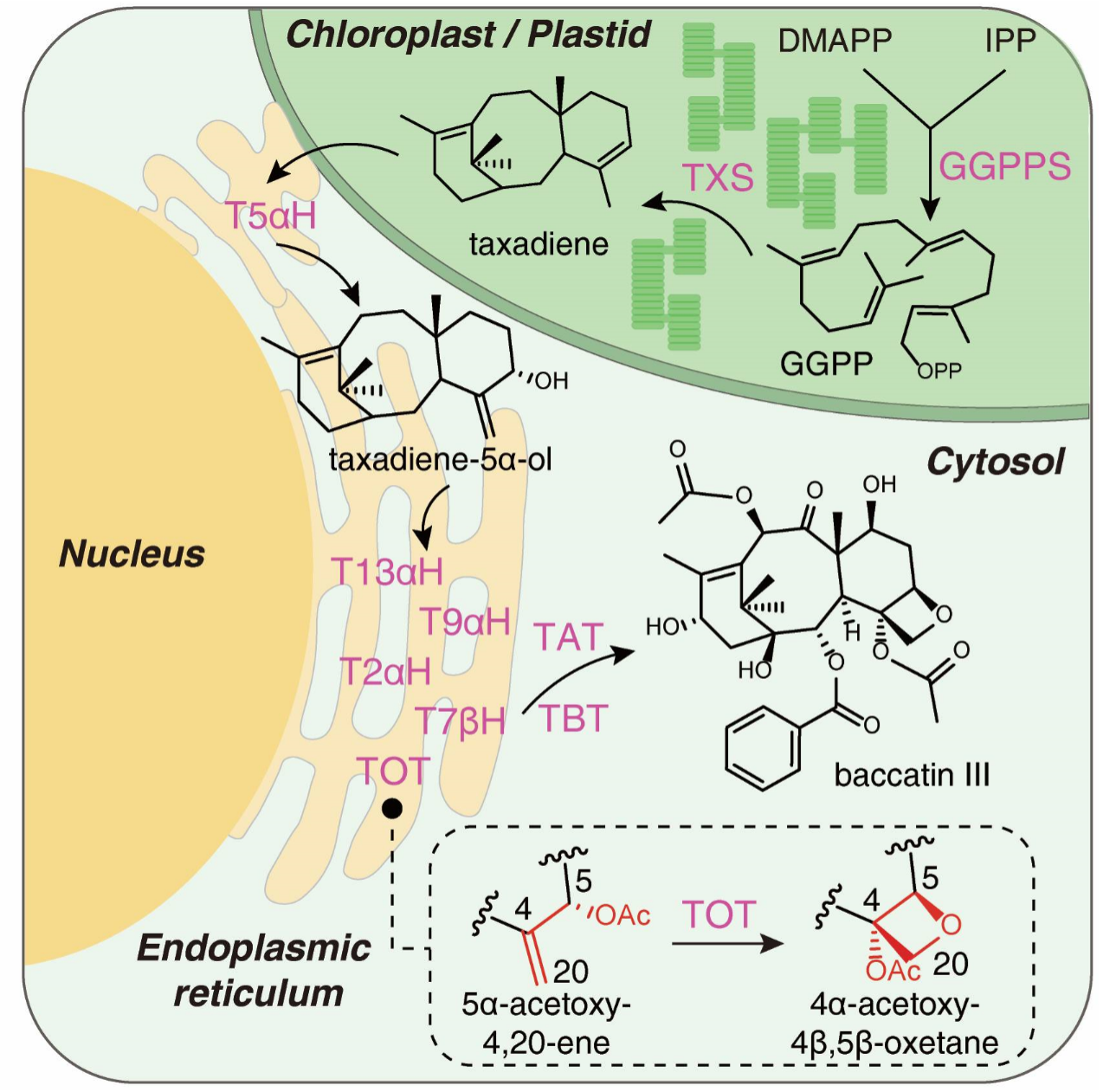 隨著生物技術(shù)的快速發(fā)展,基于合成生物學(xué)的異源合成策略已發(fā)展成為解決復(fù)雜植物天然產(chǎn)物高效制備的有力手段,因此通過合成生物學(xué)的手段實現(xiàn)紫杉醇的高效、綠色和可持續(xù)生產(chǎn)受到了廣泛的關(guān)注。然而,要實現(xiàn)紫杉醇在異源體系中的從頭合成,必須要鑒定紫杉醇生物合成通路中所缺失的關(guān)鍵酶,打通紫杉醇完整的生物合成途徑。