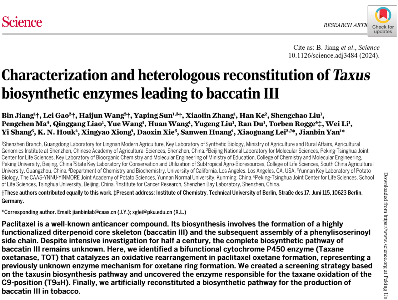 為解決上述困擾人類半個多世紀的紫杉醇生物合成難題,北京大學(xué)化學(xué)與分子工程學(xué)院、北大-清華生命科學(xué)聯(lián)合中心雷曉光教授團隊與基因組所閆建斌研究員團隊聯(lián)合國內(nèi)外其他五家科研單位通力合作,利用多組學(xué)分析、基因功能研究、天然產(chǎn)物合成與化學(xué)生物學(xué)、酶學(xué)等手段,鑒定了紫杉醇生物合成途徑中缺失的關(guān)鍵反應(yīng)酶,揭示了紫杉醇氧雜環(huán)丁烷的形成機制,最終實現(xiàn)了紫杉烷類抗癌藥物關(guān)鍵合成前體巴卡亭III在煙草中的異源合成。該研究成果解決了紫杉醇生物合成研究中的關(guān)鍵瓶頸問題,是植物天然藥物分子生物合成領(lǐng)域中里程碑式的科學(xué)突破,為利用合成生物學(xué)的手段實現(xiàn)紫杉醇的高效、可持續(xù)生產(chǎn)鋪平了道路,具有極高的科學(xué)創(chuàng)新性與應(yīng)用價值。