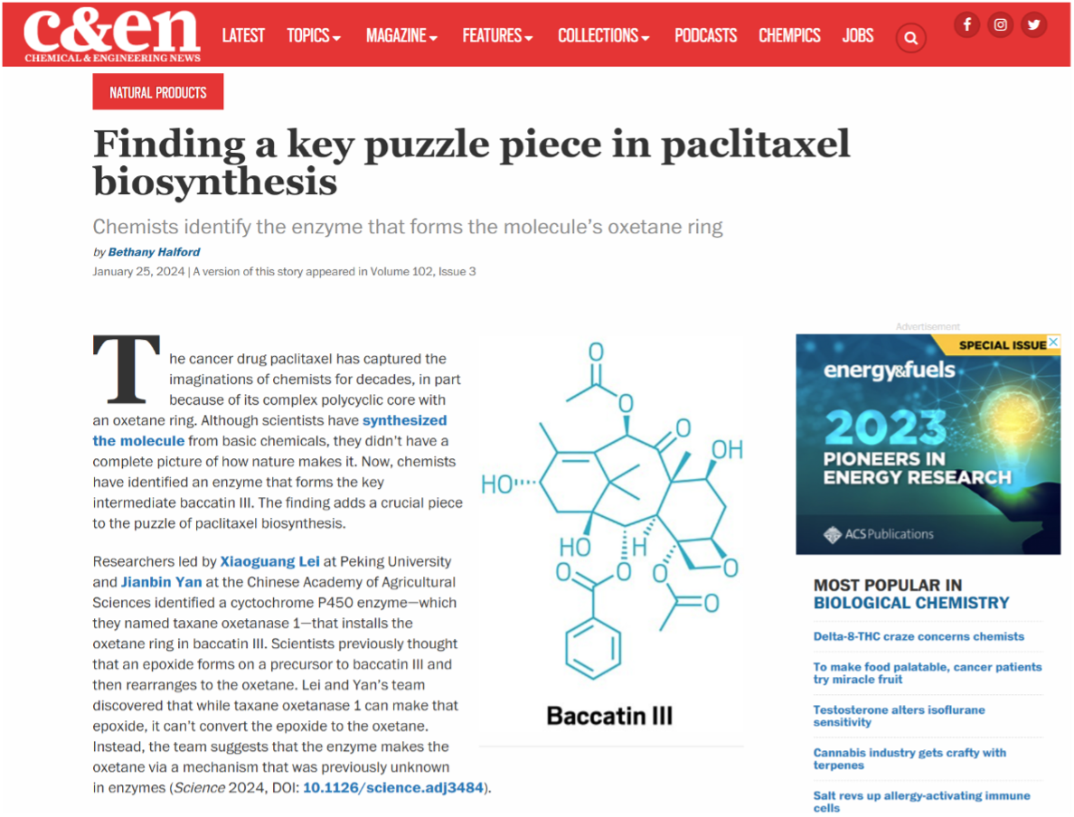 美國化學(xué)會官方雜志-化學(xué)化工新聞周刊《C&E News》新聞報道鏈接:Finding a key puzzle piece in paclitaxel biosynthesis (acs.org)