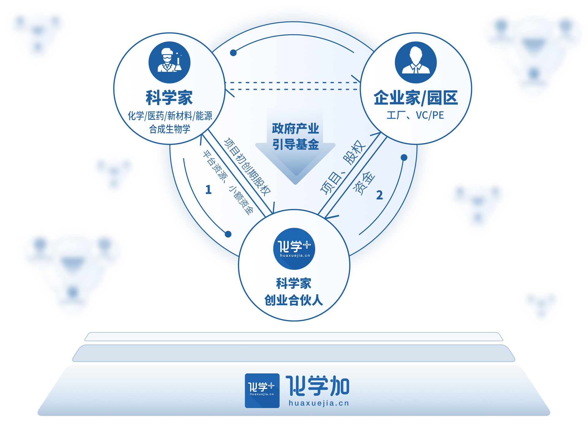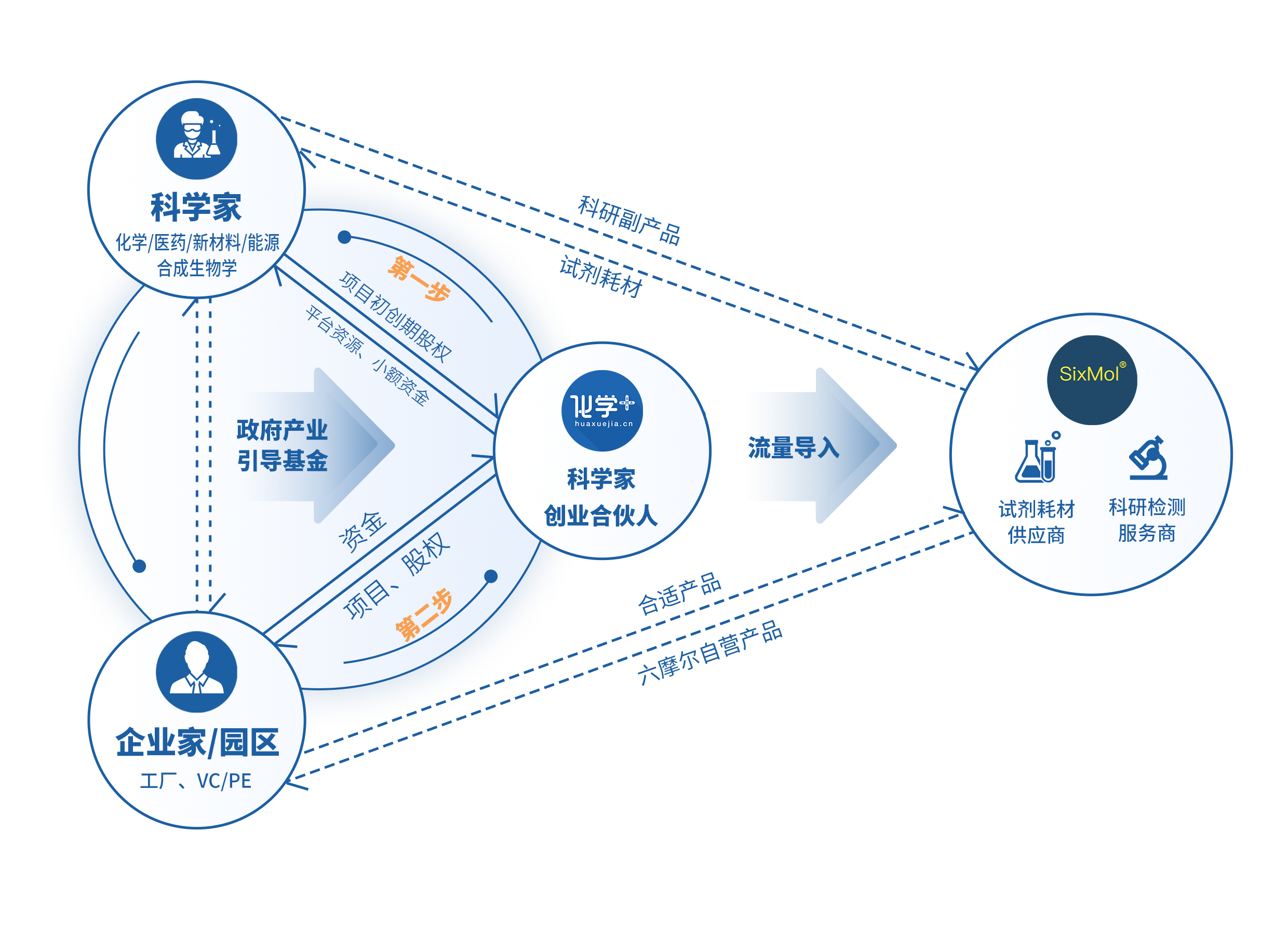 2、作為“科學(xué)家創(chuàng)業(yè)合伙人”這一角色,在科學(xué)家的橫向研究、創(chuàng)業(yè)項(xiàng)目、創(chuàng)業(yè)公司初始階段,化學(xué)加可以起到重要的角色互補(bǔ)作用,為項(xiàng)目、為科學(xué)家提供包括市場調(diào)研、企業(yè)需求對接、融資對接、園區(qū)入駐、品牌營銷(IP塑造)、人才推薦等精準(zhǔn)、有效服務(wù)。相對于傳統(tǒng)的中介方、技術(shù)經(jīng)紀(jì)人角色,該模式更加有利于保證“科學(xué)家-化學(xué)加-企業(yè)家”三方的核心利益,形成責(zé)權(quán)利共擔(dān)共享,可以相對持續(xù)的合作機(jī)制。