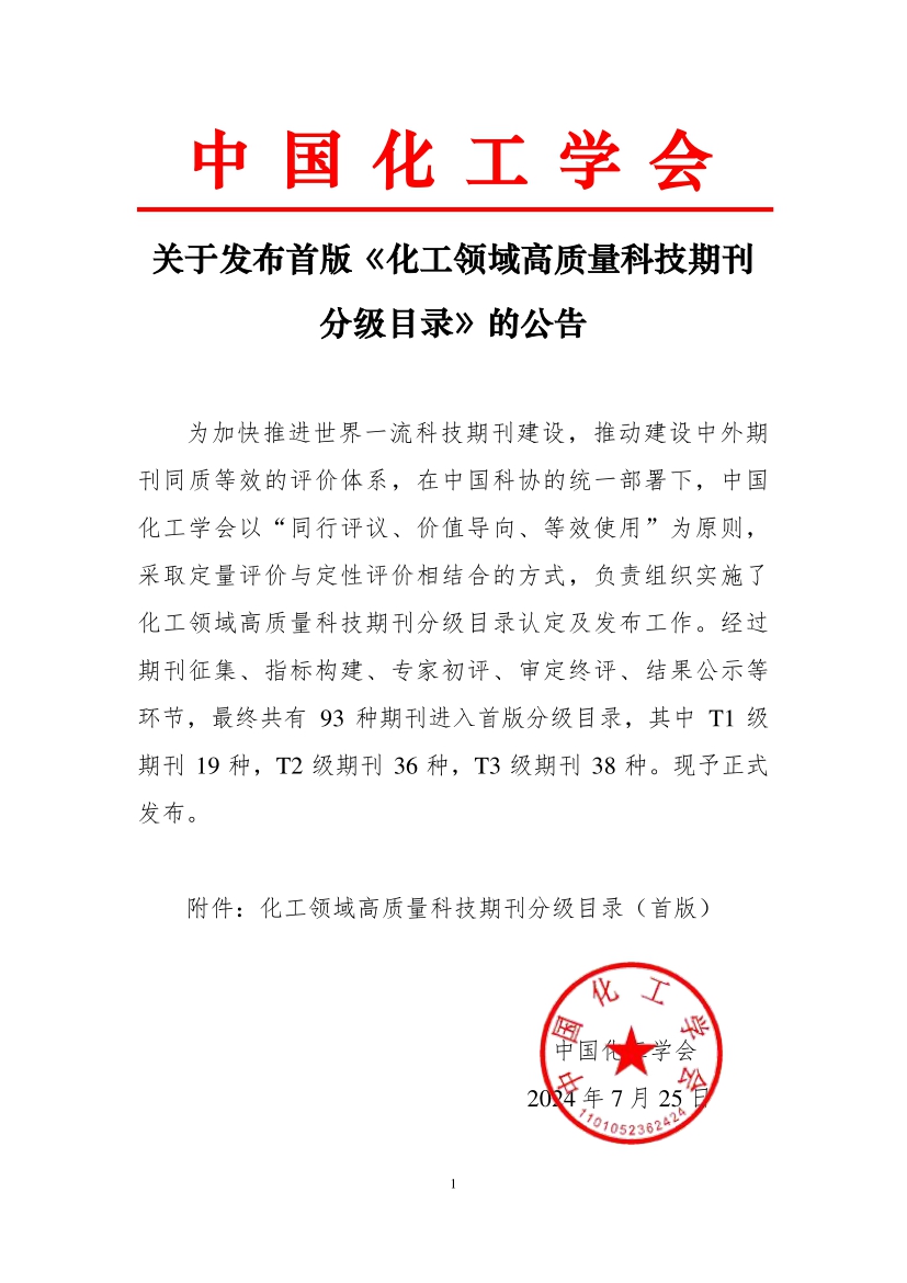 首版《化工領(lǐng)域高質(zhì)量科技期刊分級目錄》的發(fā)布,是中國化工學(xué)會(huì)在中國科協(xié)的指導(dǎo)和支持下,深入貫徹落實(shí)習(xí)近平總書記關(guān)于辦好一流學(xué)術(shù)期刊的重要指示精神,落實(shí)《關(guān)于深化改革 培育世界一流科技期刊的意見》,推動(dòng)建設(shè)與世界科技強(qiáng)國相適應(yīng)的科技期刊體系,助力我國化工領(lǐng)域科技期刊高質(zhì)量發(fā)展的重要舉措。