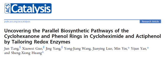 近日,云南大學(xué)醫(yī)學(xué)院尹敏課題組聯(lián)合中國(guó)科學(xué)院昆明植物研究所黃勝雄研究員課題組,在催化領(lǐng)域知名期刊ACS Catalysis上發(fā)表了題為“Uncovering the Parallel Biosynthetic Pathways of the Cyclohexanone and Phenol Rings in Cycloheximide and Actiphenol by Tailoring Redox Enzymes”的研究論文。該研究揭示了苯酚和環(huán)己酮在相同生物合成機(jī)制下形成的一種罕見(jiàn)且不同的級(jí)聯(lián)氧化還原機(jī)制,涉及由羧酸還原酶和CYP450協(xié)同催化PKS產(chǎn)物引發(fā)的分子內(nèi)羥醛縮合反應(yīng)。這一發(fā)現(xiàn)擴(kuò)展了對(duì)天然藥物分子生物合成中氧化還原酶介導(dǎo)的酚和環(huán)己酮基團(tuán)形成的理解,并為未來(lái)的組合生物合成新藥研發(fā)奠定了基礎(chǔ)。近年來(lái),尹敏研究團(tuán)隊(duì)以云南本地多種中草藥為研究對(duì)象,構(gòu)建了藥用植物內(nèi)生放線(xiàn)菌庫(kù),通過(guò)多組學(xué)聯(lián)合運(yùn)用高效發(fā)現(xiàn)了系列高潛力菌株,獲得了多個(gè)活性新天然產(chǎn)物,進(jìn)而開(kāi)展了生物合成機(jī)制的研究。
