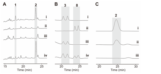 圖2:(A)野生型和突變株的HPLC圖譜。 (B) (iv) ChxJ與3孵育。 (C) ChxJ和ChxI與3孵育。